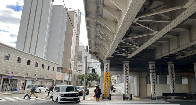 手動扉を出たら、正面を向いた状態で右方向に進み、兵庫駅方面へ線路沿いに進んで下さい。