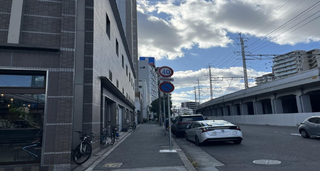 少し進むと横断歩道があります。1つ目の横断歩道を渡った後、次の横断歩道を左折し、弊所のビルへ右折してお進みください。エルスイッチと青い看板のある1階にセブンイレブン神戸相生5丁目店さんがあるビルです。
