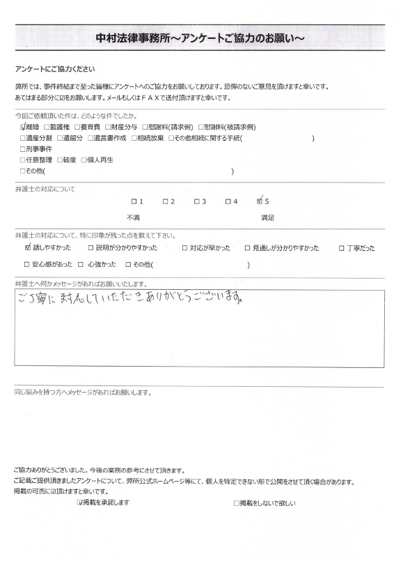 「離婚請求」話しやすかった、説明が分かりやすかった、対応が早かった、安心感があった、心強かったと頂きました