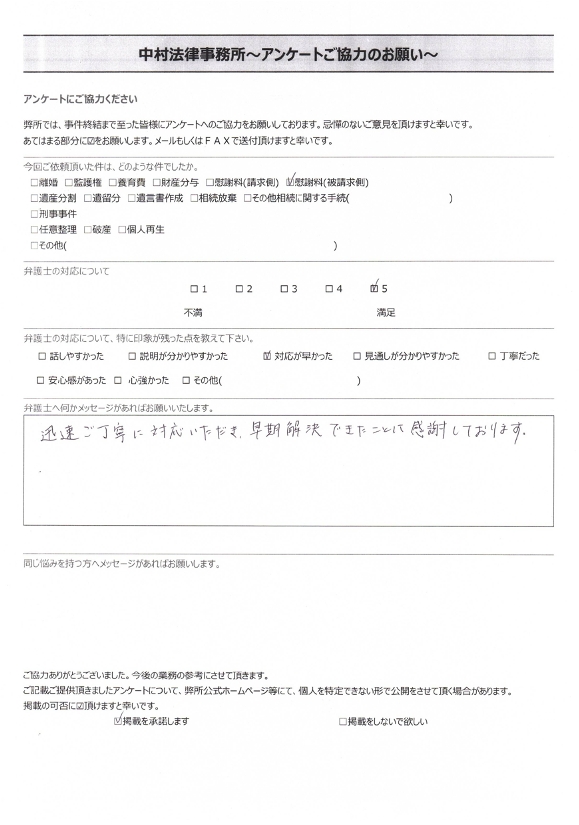 「養育費・慰謝料請求(被請求)」話しやすかった、安心感があったといただきました。