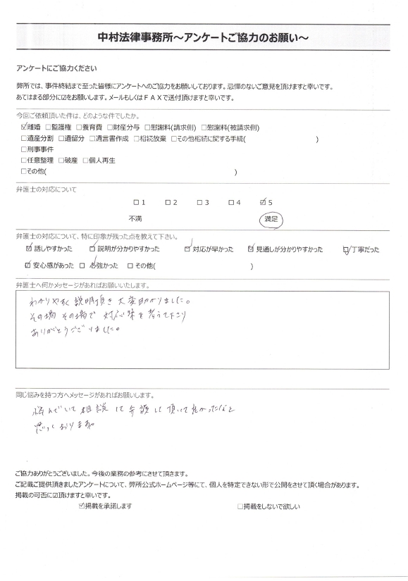 【離婚請求、婚姻費用請求】話しやすかった、説明が分かりやすかった、対応が早かった、見通しが分かりやすかった、丁寧だった、安心感があった、心強かったといただきました。