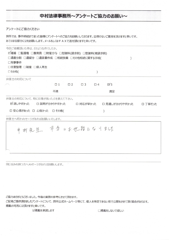 【離婚請求、婚姻費用請求】話しやすかった、説明が分かりやすかった、対応が早かった、見通しが分かりやすかった、丁寧だった、安心感があった、心強かったといただきました。