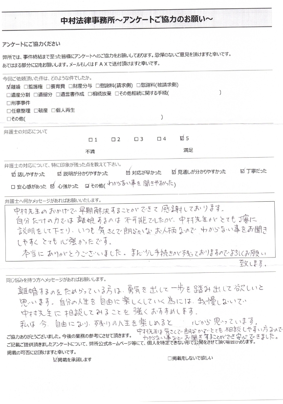 自分だけの力では離婚するのは不可能でしたが、中村先生がとても丁寧に 説明をして下さり、いつも気さくで明らかなお人柄なので、わからない事をお聞きしやすくとても心強かったです。